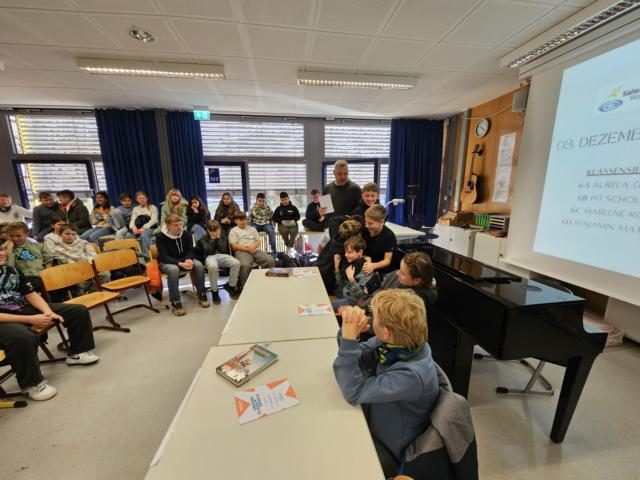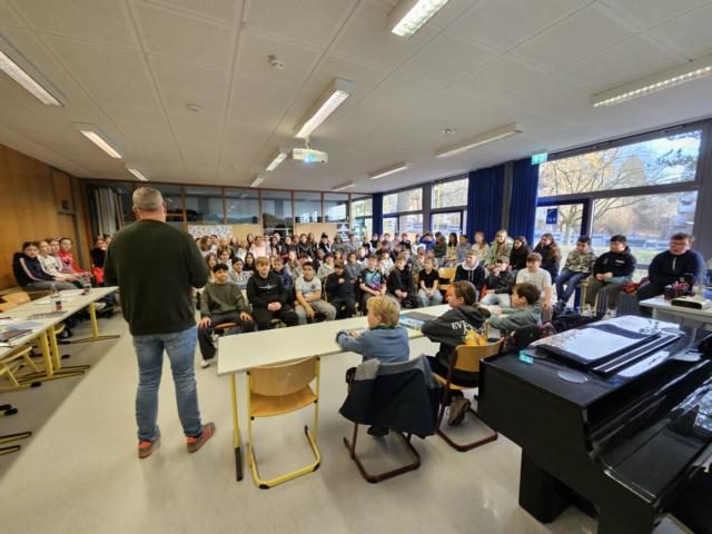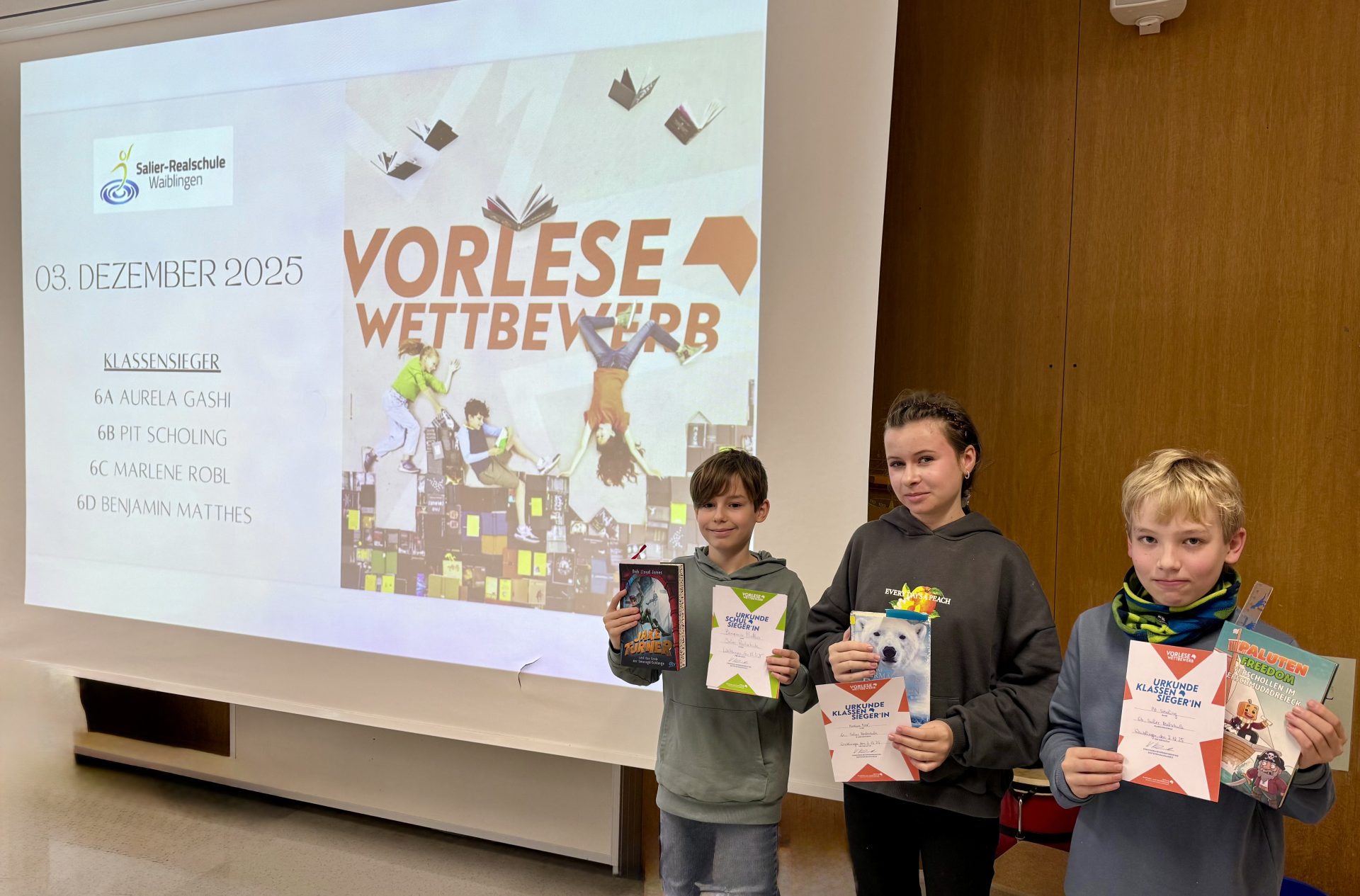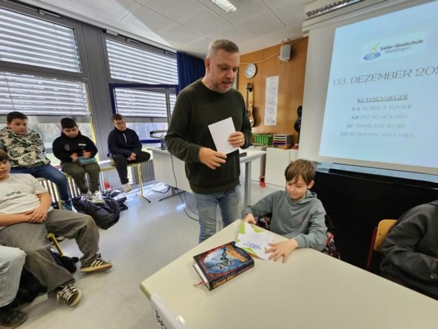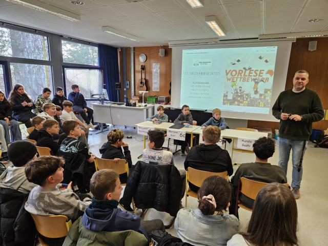 Am 3. Dezember 2025 stand an unserer Schule wie jedes Jahr der Vorlesewettbewerb der sechsten Klassen an. Die Klassensieger Pit Scholing (6b), Marlene Robl (6c) und Benjamin Matthes (6d) traten gegeneinander an und präsentierten ihr Können. Die Gewinnerin der 6a, Aurela Gashi, konnte krankheitsbedingt leider nicht teilnehmen. Unter großem Jubel und mit viel Unterstützung ihrer Mitschüler stellten die jungen Leserinnen und Leser zunächst ihre vorbereiteten Textauszüge vor. Anschließend meisterten sie die zweite Runde, in der sie einen unbekannten Abschnitt aus „Karly, Rocky und der große Schmutzky-Plan“ vorlesen mussten. Dabei zeigten alle Teilnehmenden eindrucksvoll, wie lebendig und mitreißend Vorlesen sein kann. Die Jury – bestehend aus den Deutschlehrkräften der sechsten Klassen sowie Herrn Comite – hatte die schwierige Aufgabe, unter den sehr starken Leistungen eine Entscheidung zu treffen. Nach intensiver Beratung stand der diesjährige Schulsieger fest: Benjamin Matthes (6d) konnte sich mit seinem ausdrucksstarken Vortrag durchsetzen. Benjamin durfte sich nicht nur über seine Urkunde freuen, sondern erhielt zusätzlich einen Buchgutschein. Auch die anderen Klassensieger wurden mit kräftigem Applaus und einer Urkunde für den Klassensieg und für ihre tollen Beiträge gefeiert. Wir gratulieren Benjamin ganz herzlich und danken allen Beteiligten für einen gelungenen Wettbewerb. Für den bevorstehenden Kreisentscheid drücken wir Benjamin fest die Daumen!