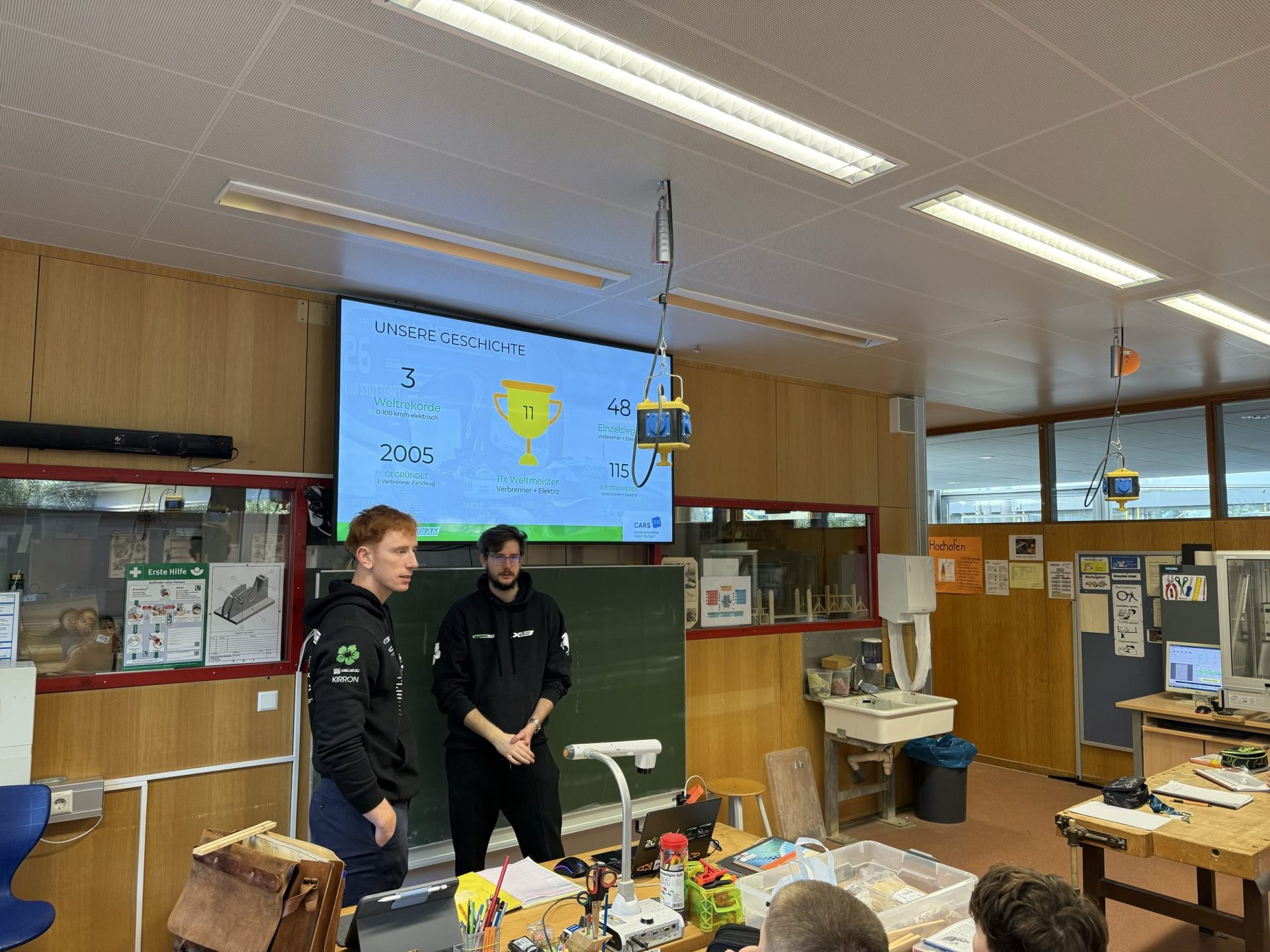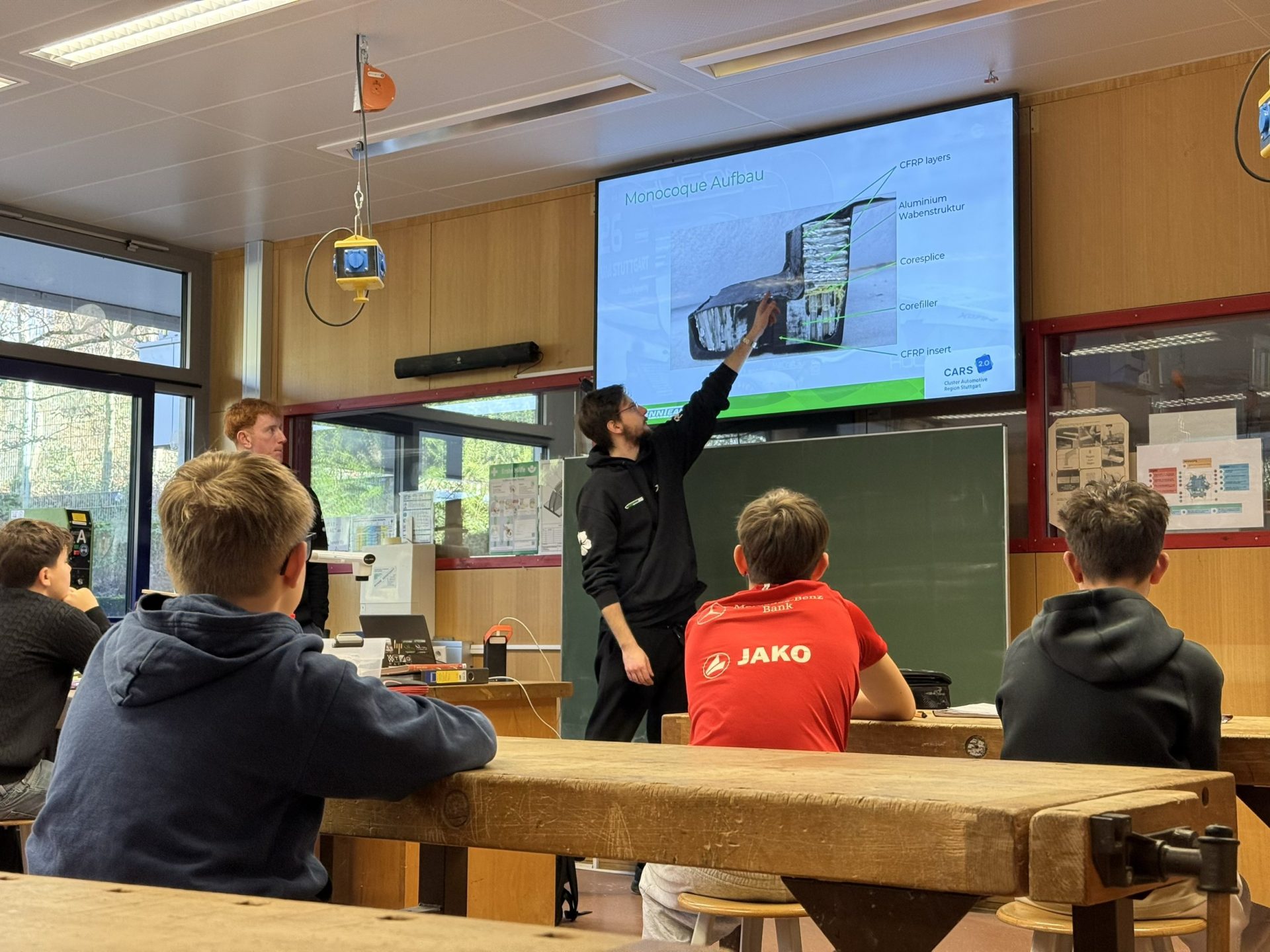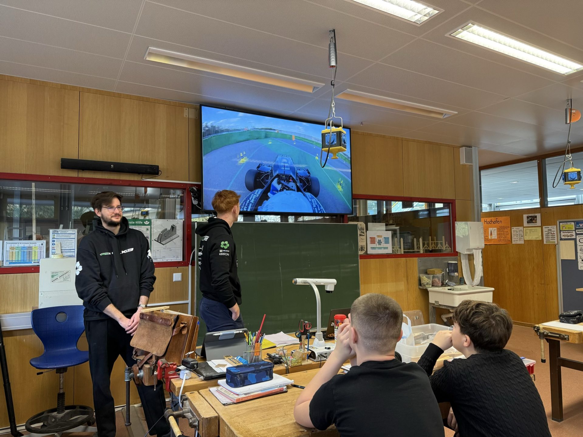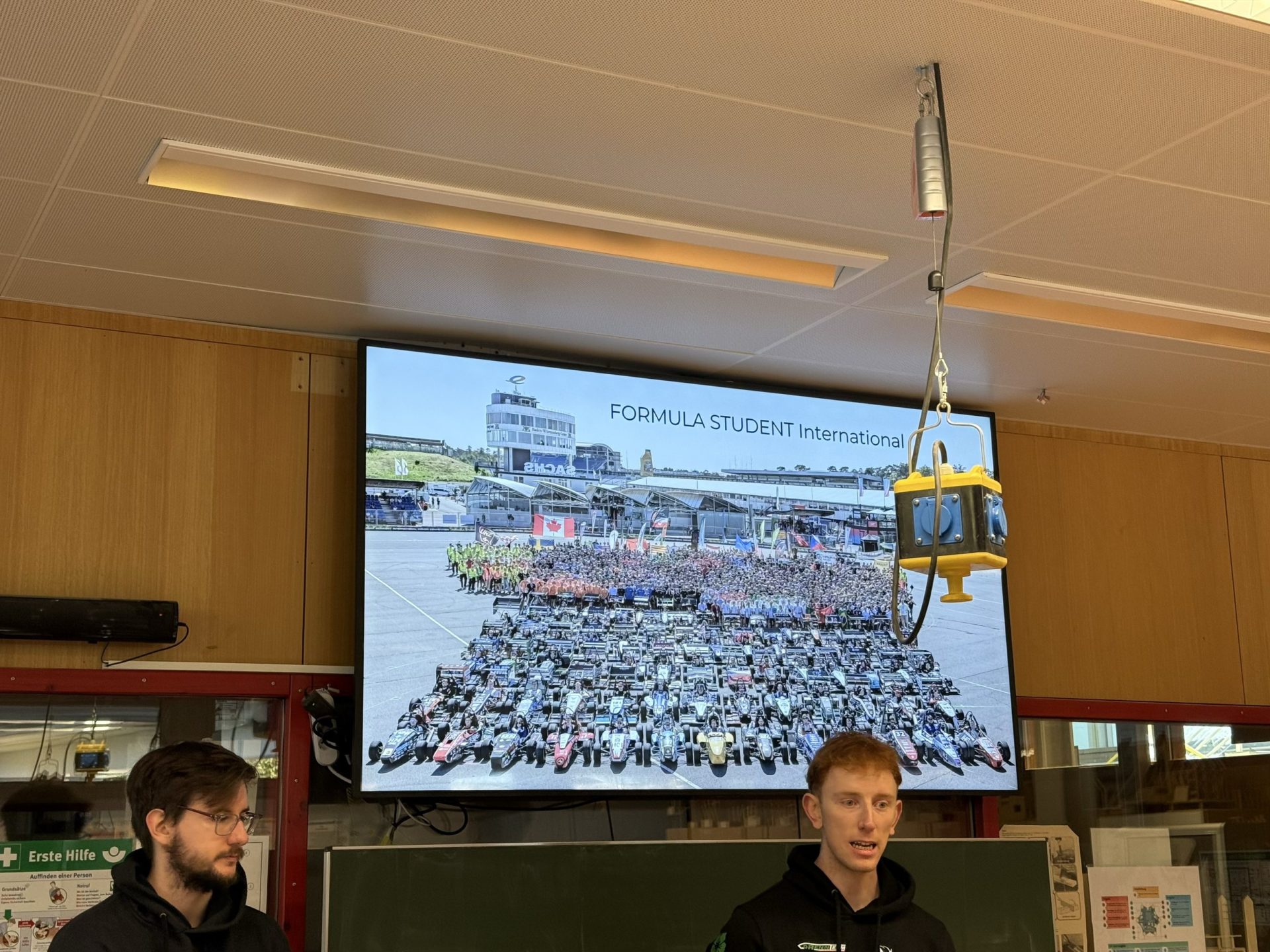 Im Rahmen der Berufsorientierung und zur Förderung der MINT- und Technikbegeisterung durften wir ein ganz besonderes Team an unserer Schule begrüßen: das Rennteam Uni Stuttgart. Zwei Teammitglieder stellten ihre Arbeit vor – darunter auch ein ehemaliger Schüler unserer Schule: Lars. Allein dieser persönliche Bezug machte den Besuch für viele Schülerinnen und Schüler besonders greifbar und motivierend.