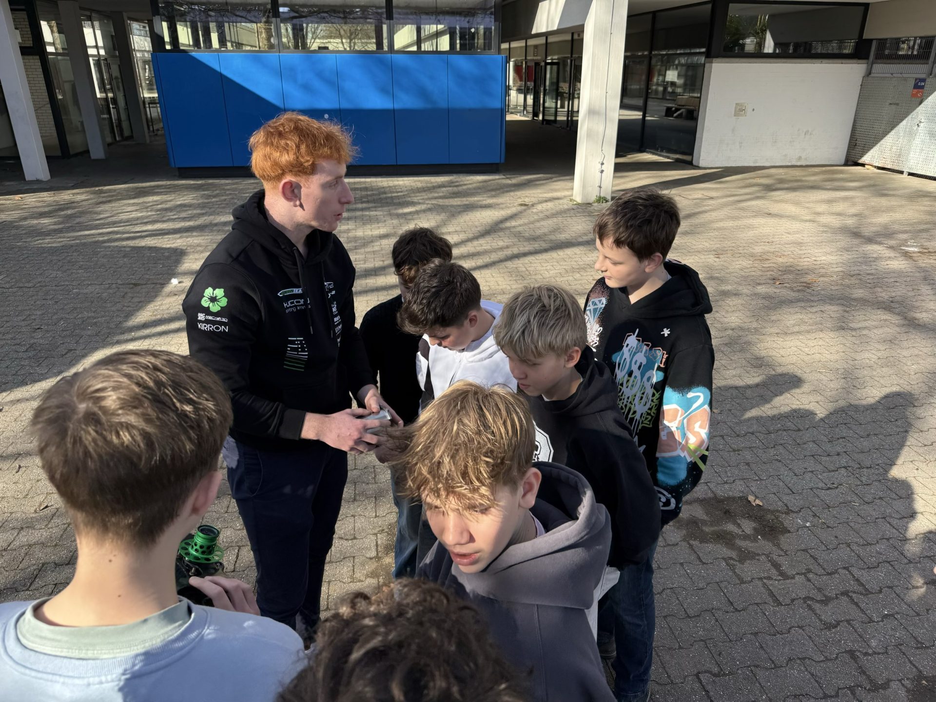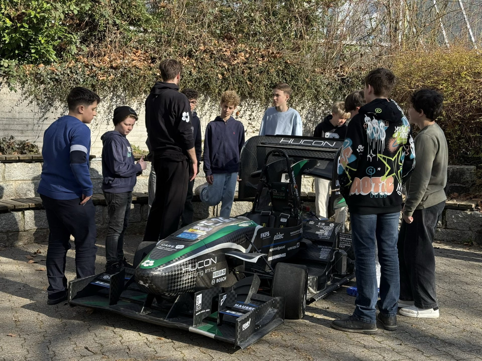 Dann folgte das absolute Highlight des Tages: Auf dem Schulhof wartete eine Überraschung. Dort stand – ganz real und zum Anfassen – der Rennwagen des Teams. Die Begeisterung war sofort spürbar. Die Schülerinnen und Schüler durften das Auto aus nächster Nähe betrachten, einzelne Bauteile genauer untersuchen und sich alles erklären lassen. Auch Fotos waren ausdrücklich erlaubt – ob neben dem Auto oder sogar mit dem Lenkrad in der Hand. Für viele war das ein unvergesslicher Moment.