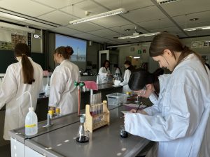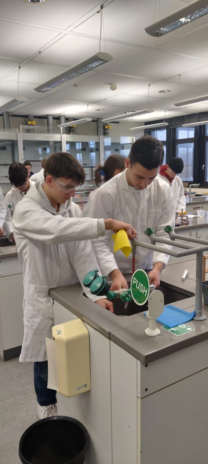 Im Chemieunterricht am außerschulischen Lernort Unicorner in Schwäbisch Gmünd beschäftigen sich die Schülerinnen und Schüler mit den Eigenschaften und Reaktionen von Säuren und Laugen. Sie führen Experimente durch, werten ihre Ergebnisse aus und lernen den sicheren Umgang mit chemischen Stoffen.